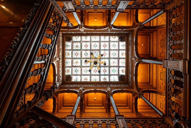 Two Temple Place sits on the Victoria embankment and was commissioned by and built for William Walforf Astor in the 1890s. Both an ornate historical and literary fantasy, and a working office, it retains that unusual public-private mode to this day. It is a dazzling neo-Tudor gem with an array of whimsical and Gothic elements. It was designed by renowned architect John Loughborough Pearson, who brought together some of the best craftsmen at the time to create the elaborate decoration found throughout the building.